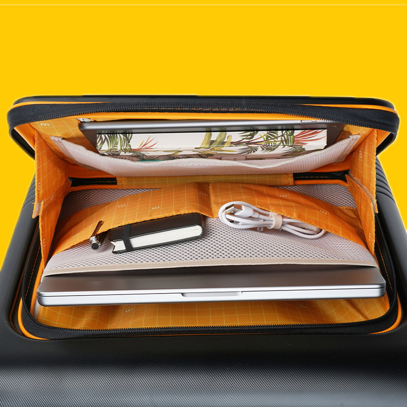 Front tech compartment gives you quick access to your tech during airport security checks. Fits up to a 14” laptop, an iPad, your charger, a notepad, your passport and boarding pass.