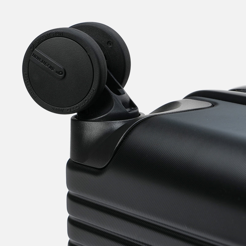 8 super silent Japanese Hinomoto wheels. Perfect for creeping ahead in airport queues. Glides just as smoothly on floors and carpeted surfaces.