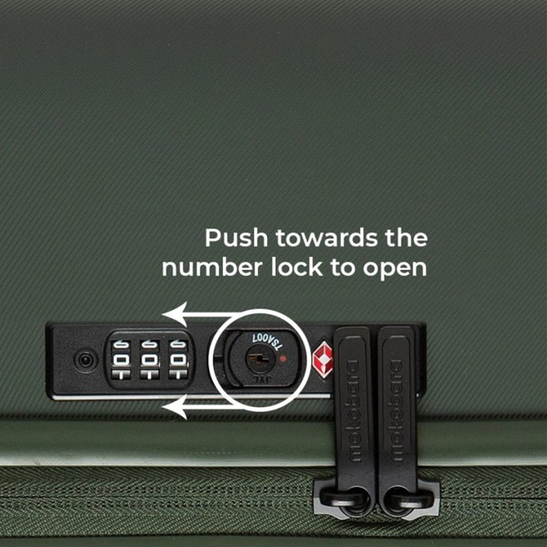 Keyless TSA Lock security. This lock does not require a key for you to unlock. Simply push the latch towards the numbers to unlock. Instructions to set your lock code will be inside the luggage.