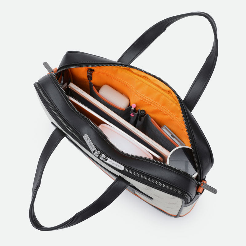 - The main compartment features slip pockets, pen pockets, a zipper pocket and an elastic multi-utility pocket that’s perfect for storing your AirPods/AirTags.